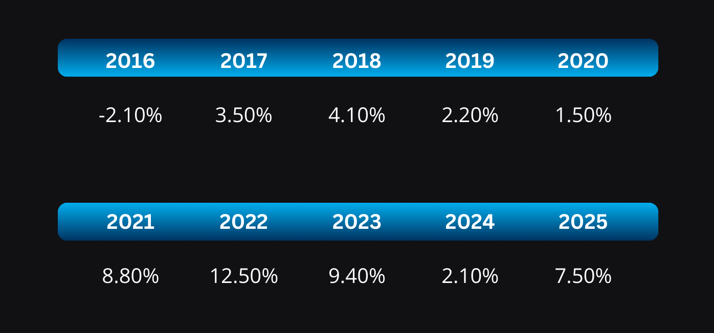 While your income may not have doubled, electricity rates in Connecticut have aggressively outpaced standard inflation. Here is the year-over-year rate increase from 2015 to 2025.